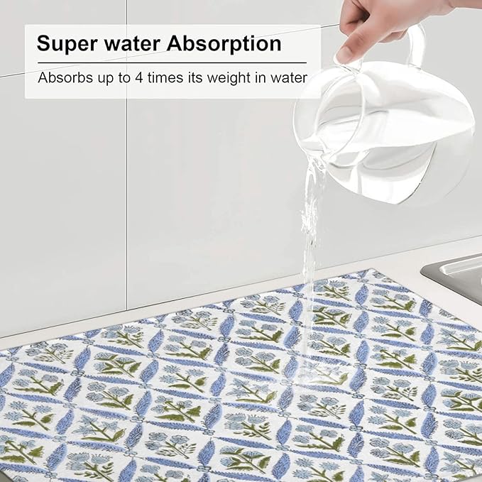 - 【Widely Used】:The blue floral dish drying mat is widely used,you can put it on kitchen counter,dining table,living room,office and anywhere you like,it has water absorption and and protect your table