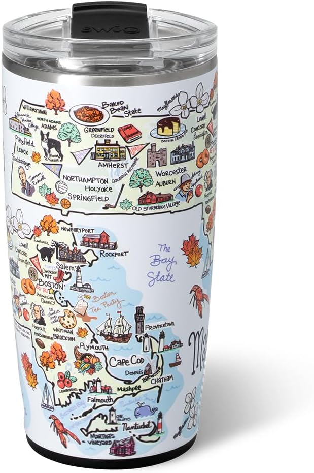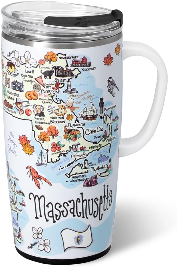 Swig Life 22oz Travel Mug, Insulated Tumbler with Handle and Lid, Travel Coffee Mug, Cup Holder Friendly, Stainless Steel 22 oz Tumbler, Reusable Insulated with Lid (Massachusetts)
