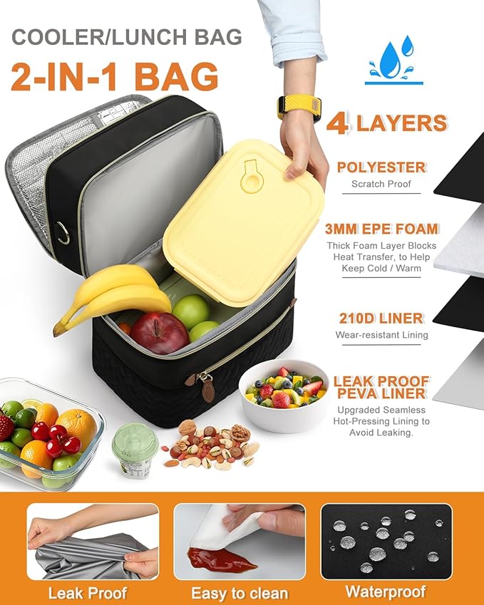 - 【2 in 1 Bag 】Need a lunch bag that does more than just carry food? You’ve found it. Whether you're heading to work with a hot meal or packing chilled drinks for a weekend outing, the leakproof, heat-pressed PEVA lining keeps everything at the right temperature, without spills or mess. The water-resistant outer layer handles everyday splashes with ease, and cleanup takes just seconds. One bag, two jobs—easy, reliable, and always ready to go