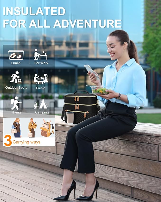 Capolo Lunch Box for Women Men Adults,Double Deck Insulated Lunch Bag Leakproof Lunch Cooler Box with Removable Strap Lunch Tote Bags Reusable Thermal Lunchbox for School Work Picnic(Large,Black)