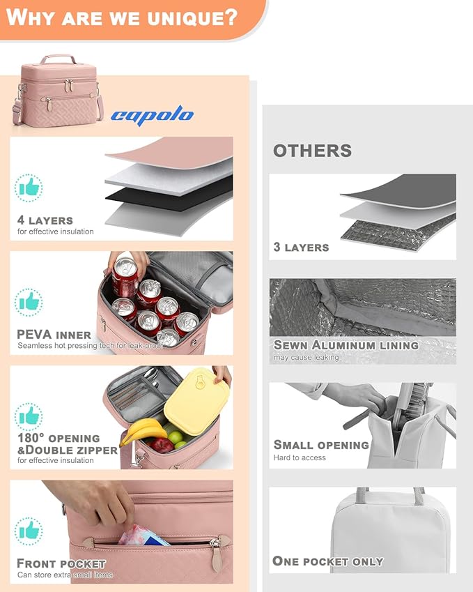 - 【Upgrade Insulated & Leak-proof & Sweat-Free Material】4-layer insulation system, the waterproof polyester outer adds abrasion protection, thick 3mm EPE foam insulation helps to prevent heat transfer, durable 210D liner lowers the risk of tearing, and a heat-pressed PEVA interior is leakproof and wipes clean in seconds—no more worries about spills or stains. Every layer is crafted for max performance. Whether you're packing hot soup or cold drinks, your food stays just the way you like it