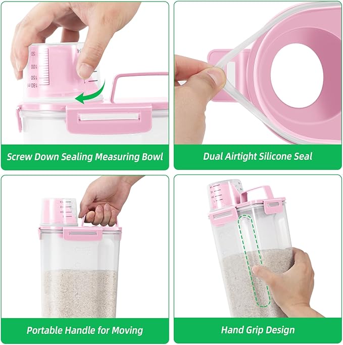 - Easy Pouring: The rice storage container features a pouring spout makes it a breeze to dispense your ingredients. Its ergonomic design offers a comfortable grip for easy, single-handed pouring