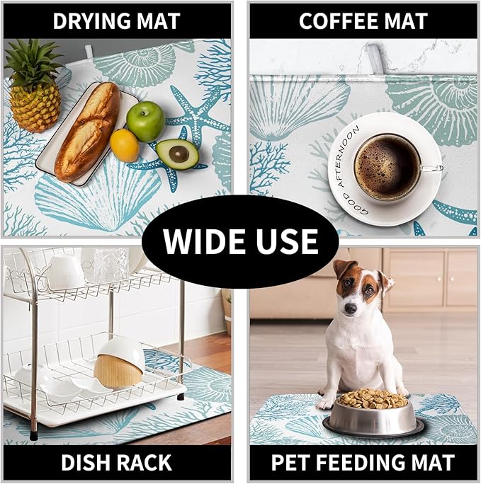 - Multifunctional Pad: Beautiful print on surface side, and reverses to a solid color. The beachy dish mat absorbs water well, great for air drying dishes, glasses, bottles, silverware, fruits and vegetables, adds stability when drying fragile items