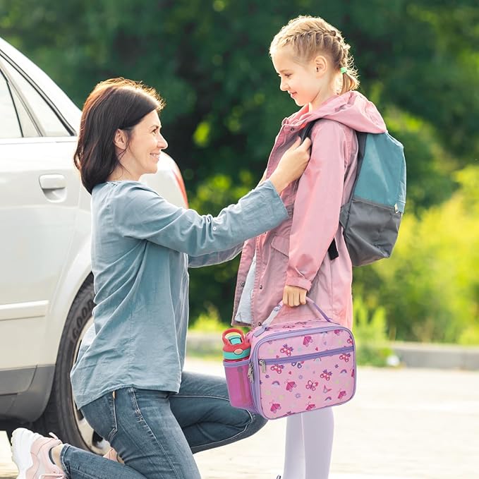 Bagseri Kids Lunch Bag for Girls - Insulated Kids Lunch Box for Daycare and School Reusable Meal Tote Bag with Water Bottle Holder, Easy-Clean Water-Resistant Fabric, Pink Butterfly
