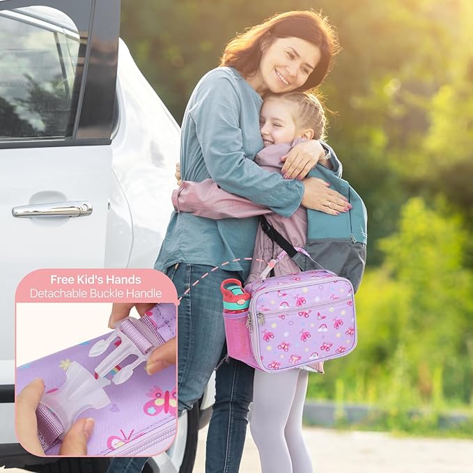 Bagseri Kids Lunch Bag for Girls - Insulated Kids Lunch Box for Daycare and School Reusable Meal Tote Bag with Water Bottle Holder, Easy-Clean Water-Resistant Fabric, Purple Butterfly
