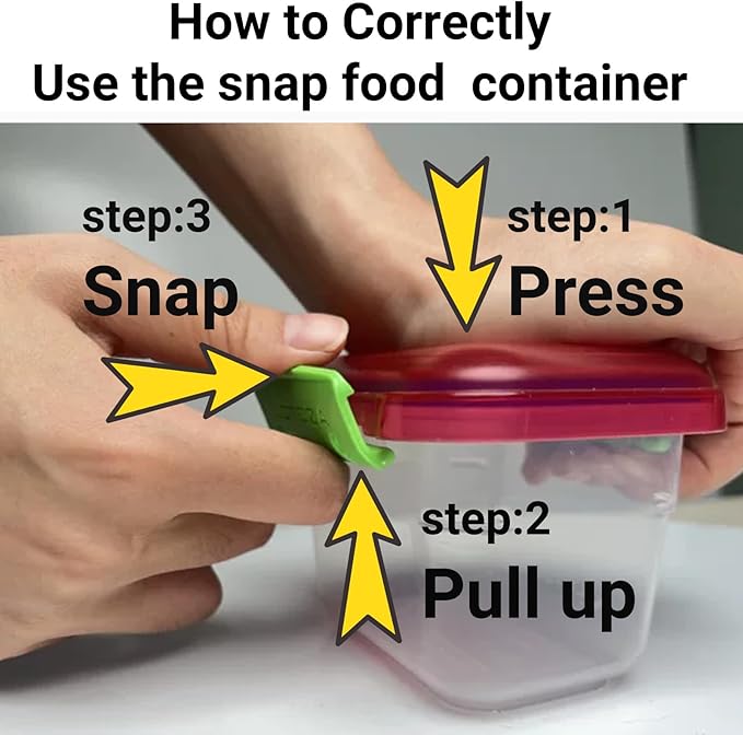 - Important Tips!!!How to correctly close the snap food container: Step 1 Press the lid flat to expel air; Step 2 Pull each tab up slightly to align the rim; Step 3 Snap every latch firmly until it clicks. Aclarification:the container is not suitable for children alone under 12 years old