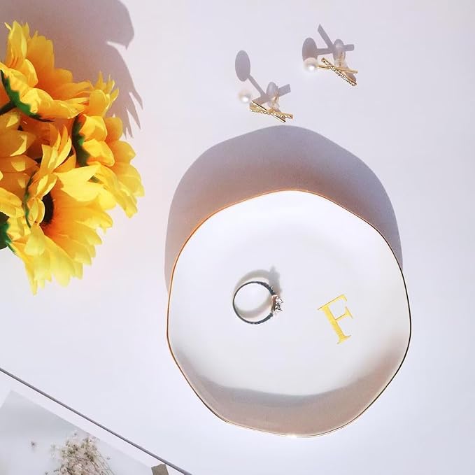 Ceramic Jewelry Tray Initial Ring Dish Personalized A-Monogrammed Engagement Wedding Gifts, for Birthday Mother's Day Christmas for Women, Ceramic White 4.75" (F)
