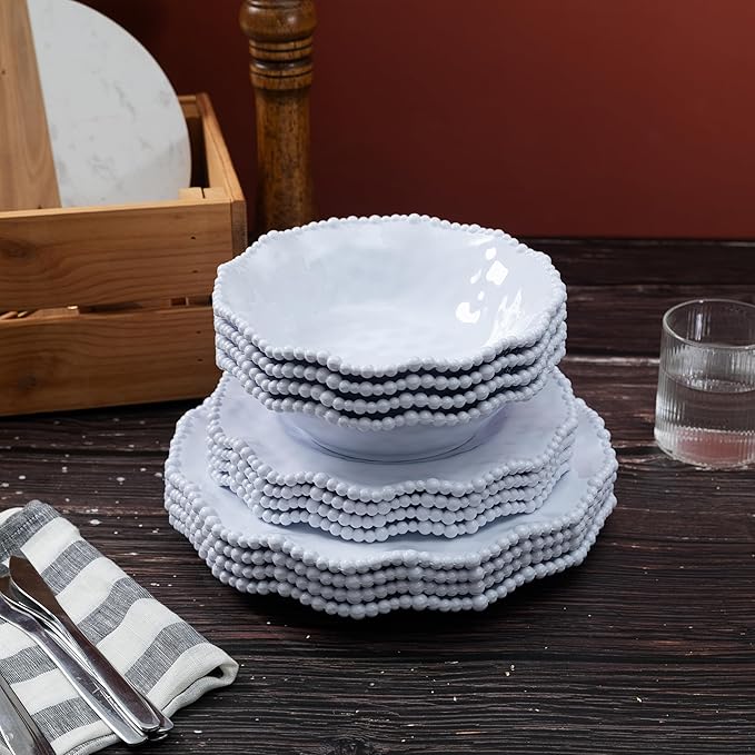 12-Piece White Beaded Melamine Dinnerware Sets – Chip-Resistant Plates & Bowls, Farmhouse Dining Set includes 4 dinner, 4 Salad and 4 Bowl – Ideal for RV, Cabin, Daily Use