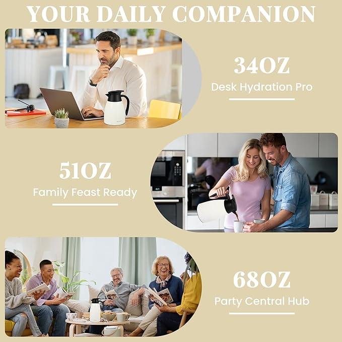 - Durable 304 Stainless Steel:Double-Stainless steel coffee carafe with double-walled 304 food-grade interior/exterior, odor-free. Non-slip base + scratch-resistant surface. Reusable thermos carafe for home/office