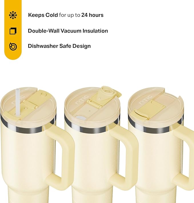 RTIC 40 oz Road Trip Tumbler Double-Walled Cermaic Lined Insulated Stainless Steel Portable Travel Coffee Mug Cup with Lid, Handle and Straw, Sunlight Glitter