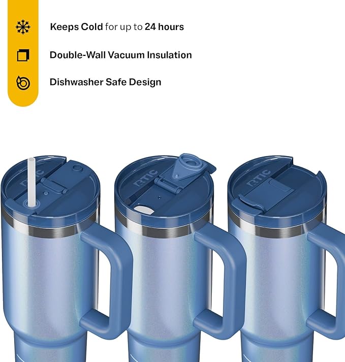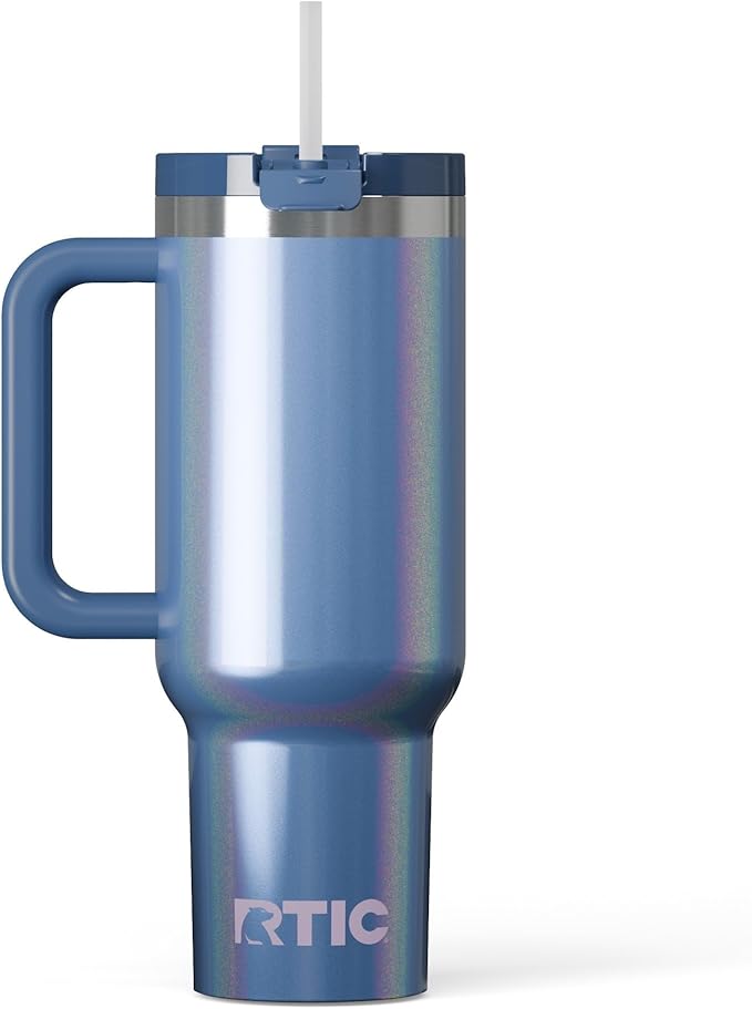 RTIC 40 oz Road Trip Tumbler Double-Walled Cermaic Lined Insulated Stainless Steel Portable Travel Coffee Mug Cup with Lid, Handle and Straw, Pond Glitter