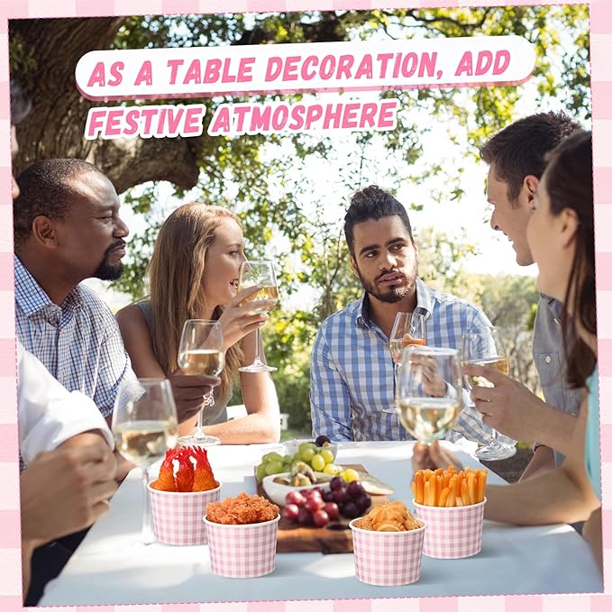 - Pink Gingham Theme: detailed with pink gingham theme on a white background, these paper snack bowls instantly add interest to the decoration and atmosphere; The overall style is retro, elegant and sophisticated, whether for an ice cream themed party or a simple family event, these pink gingham paper cups are ideal tableware decorations