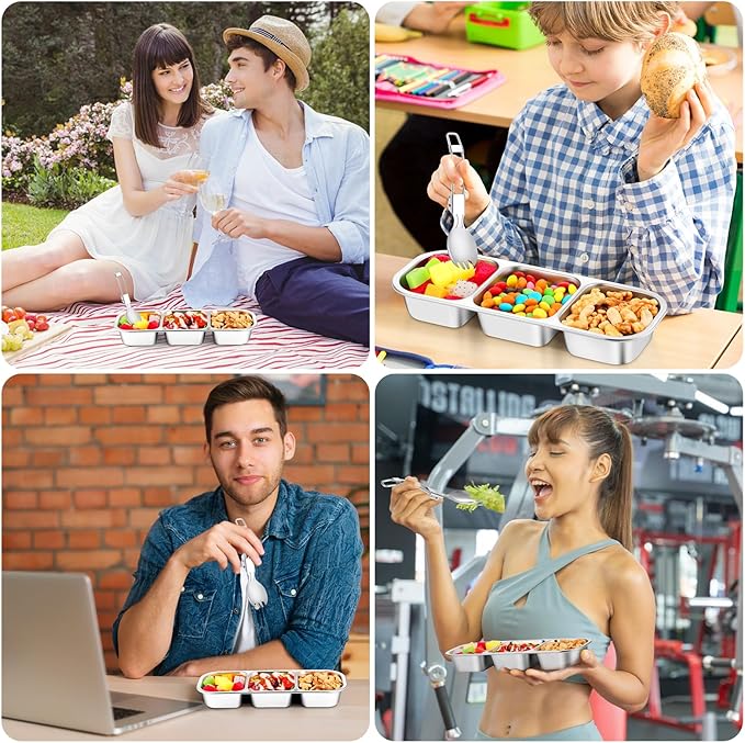 Stainless Steel Snack Containers with Lids & Spork, Reusable 3 Compartment Condiment Boxes, Divided Grab Food Storage Containers, Sauce Cups for Home, Travel (3 Compartment)