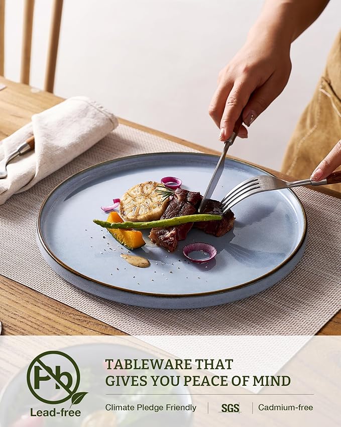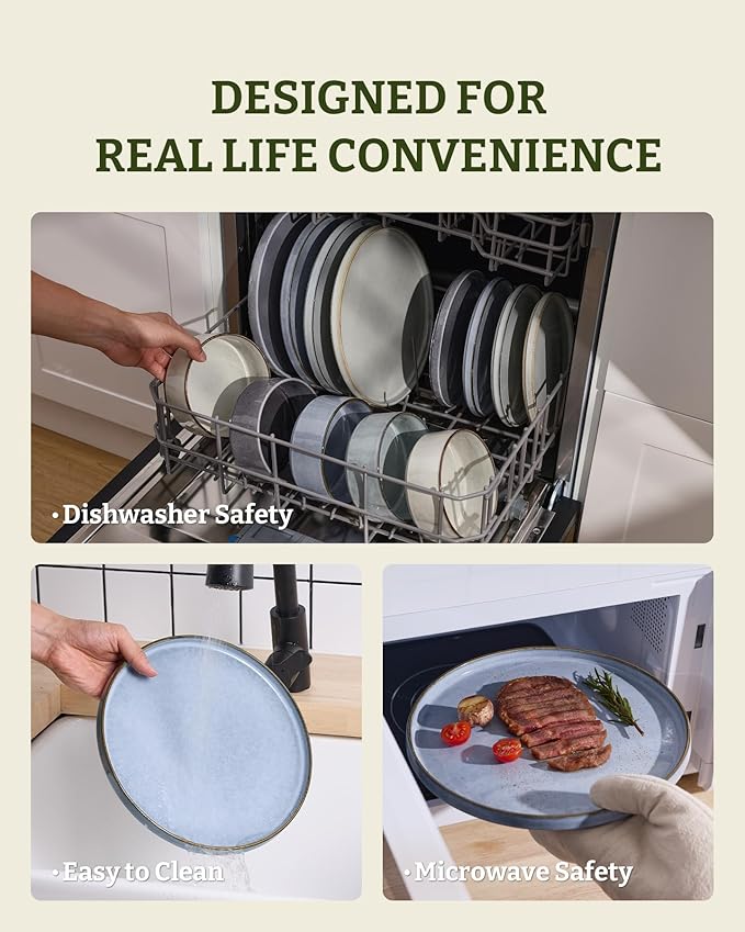 - Upgrade Your Everyday Dining With Artisan Stoneware: Stoneware dishes in dreamy gray-blue and white. Each piece features a unique reactive glaze and a hand-accented rim for a minimalist, high-end look that’s built to last.