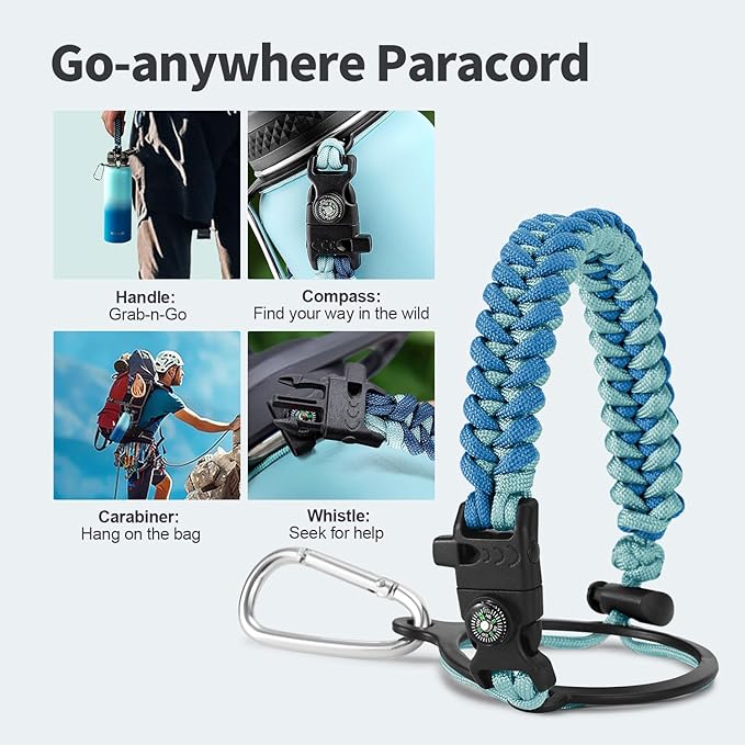 - Palm Fitting Paracord Handle: Compared to handle lids, nylon paracord on the bottle gives you more choices in terms of color coordination and coziness on your hands. Match the handle with your bottle to make a complete outdoorsy look. Compass and carabiner can be lifesavers for hiking and other expeditions