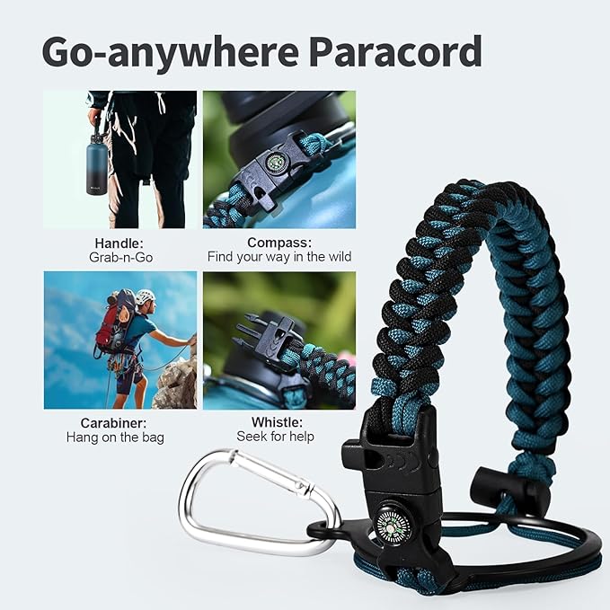 - Palm Fitting Paracord Handle: Compared to handle lids, nylon paracord on the bottle gives you more choices in terms of color coordination and coziness on your hands. Match the handle with your bottle to make a complete outdoorsy look. Compass and carabiner can be lifesavers for hiking and other expeditions