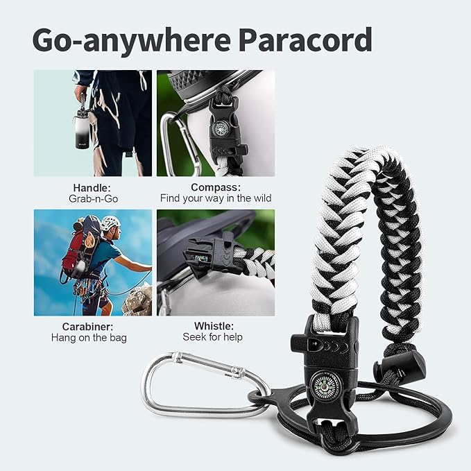 - Palm Fitting Paracord Handle: Compared to handle lids, nylon paracord on the bottle gives you more choices in terms of color coordination and coziness on your hands. Match the handle with your bottle to make a complete outdoorsy look. Compass and carabiner can be lifesavers for hiking and other expeditions
