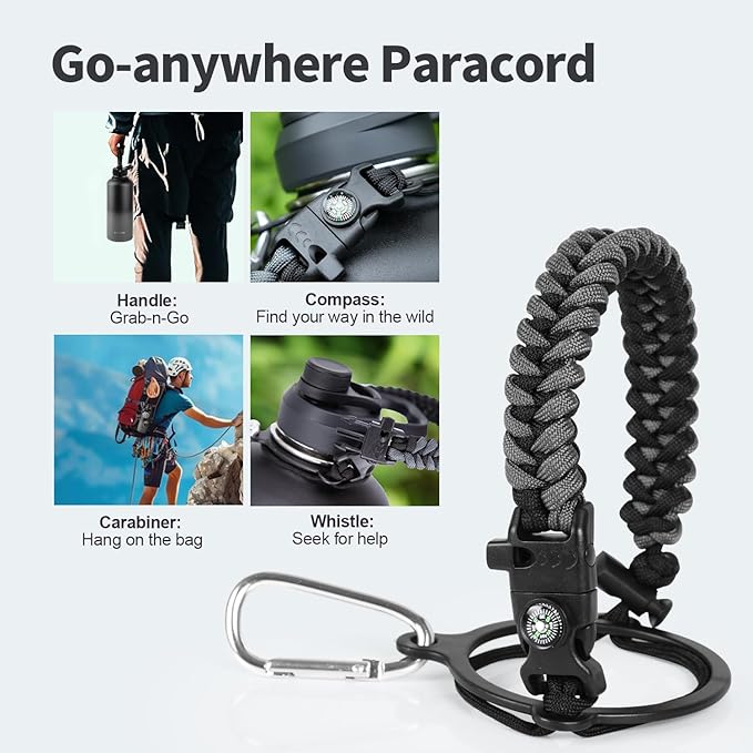 - Palm Fitting Paracord Handle: Compared to handle lids, nylon paracord on the bottle gives you more choices in terms of color coordination and coziness on your hands. Match the handle with your bottle to make a complete outdoorsy look. Compass and carabiner can be lifesavers for hiking and other expeditions