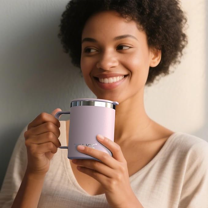 TILUCK 12 oz Insulated Coffee Mug with Lid, Leak-Proof Stainless Steel Travel Mug Cup with Handle for Hot or Cold Drinks(LightPurple, 12oz)