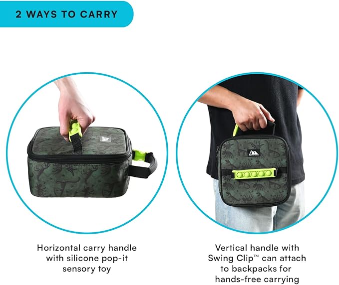 - EASY TO CARRY: Pop-it vertical handle provides a fun, sensory experience while the horizontal handle features a Swing Clip to easily attach the lunch box to a backpack.