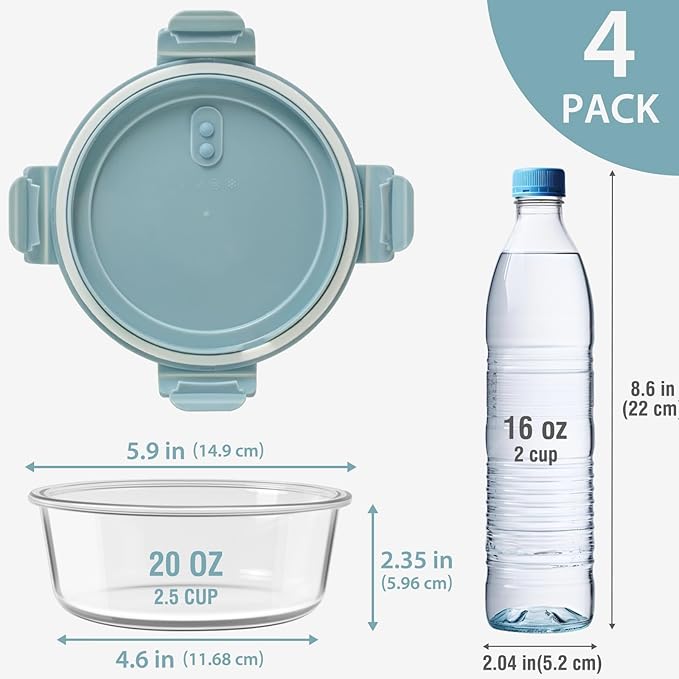 20oz Food Storage Containers with lids Set, Airtight 2.5 Cup Glass Meal Prep Containers, Heat-Resistant BPA-Free Glass Containers for Soup Leftover, Microwave, Dishwasher Freezer Safe (4 Packs)