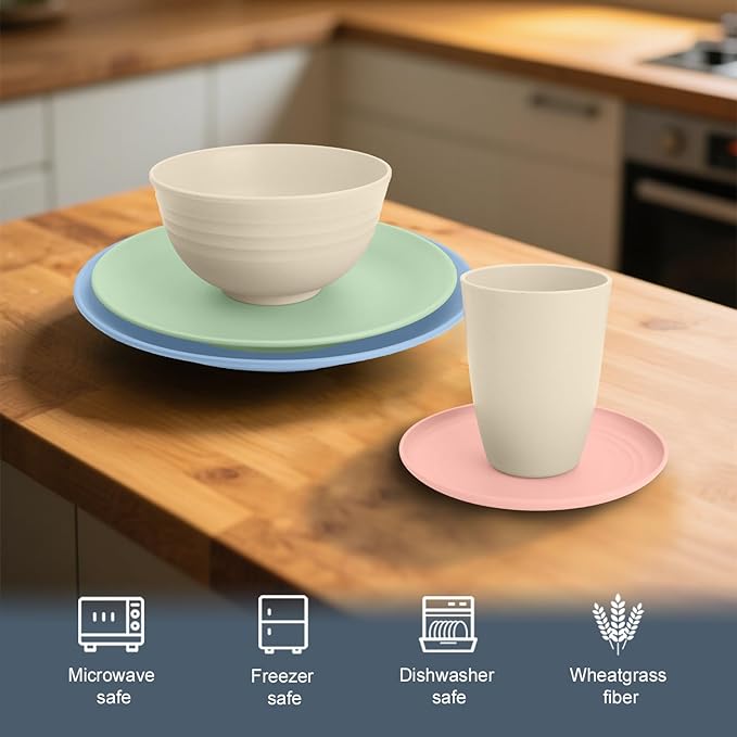 - PREMIUM WHEAT STRAW MATERIAL: These wheat straw dinnerware sets are made from practical wheat straw fiber and high-quality PP materials. They are non-toxic and 100% BPA-free