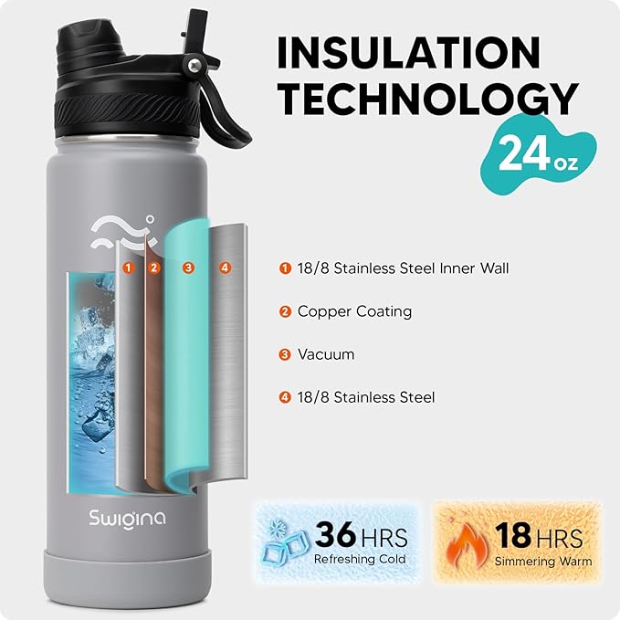[2-IN-1 LID] Insulated Water Bottle with Silicone Boot (36hrs Cold/18hrs Hot) - DIY Stickers, Leakproof, BPA Free, 24 oz