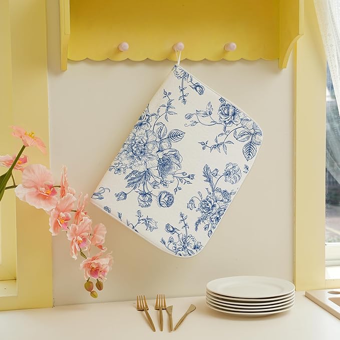 - 【Foldable and Hangable】 Designed with a hanging loop, our blue floral decorative dish drying mats can be easily hung up when not in use, saving valuable counter space. It is also foldable and soft, allowing for easy storage in cabinets or drawers.The neat edge stitching ensures durability and prevents fraying over time