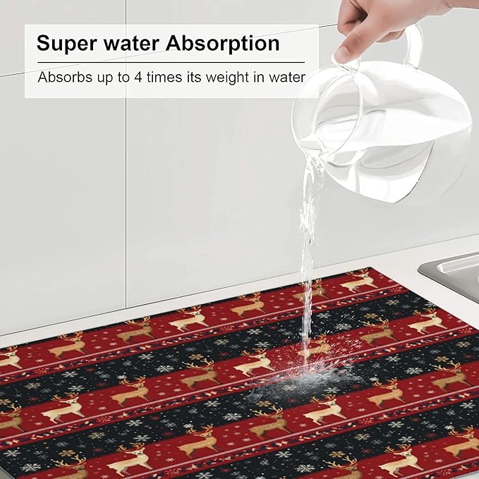 Christmas Reindeer Dish Drying Mat for Kitchen Counter Microfiber Super Absorbent Non-Slip Dish Drying Pad for Countertops Dishes Utensils Stylish Quick-Dry Machine Washable 18x24 Inch