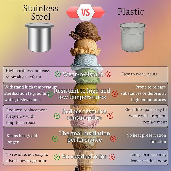 - š„ Premium stainless steel ----Stainless steel creami deluxe pint containers are made of food grade 304 stainless steel, shatterproof and not easy to deform, BPA free, no microplastics or nano plastics, no longer have to worry about easy to wear and tear and easy to produce plastic debris like plastic containers! The product is made of 304 stainless steel, no Phenol A, no microplastic or nano plastic, no more worries about plastic containers that are prone to wear and tear and plastic debris