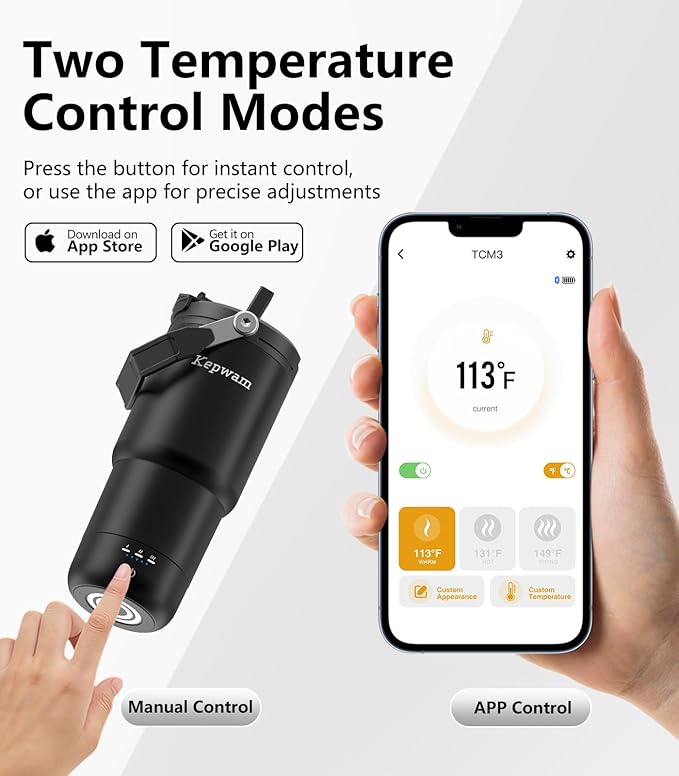- 【App & Manual Dual Control】 Easily adjust power and temperature with the button or Bluetooth control via the Kepwam App. Monitor real-time temperature, set your preferred temperature range (113°F to 149°F in 1°F increments), and customize the appearance.