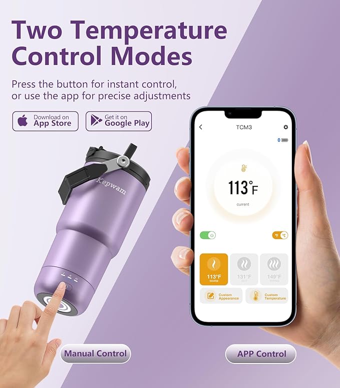 - 【App & Manual Dual Control】 Easily adjust power and temperature with the button or Bluetooth control via the Kepwam App. Monitor real-time temperature, set your preferred temperature range (113°F to 149°F in 1°F increments), and customize the appearance.