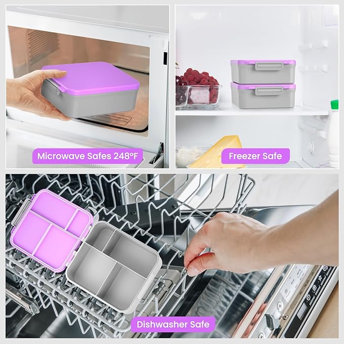 - Leak-Proof Bento Box with Compartments: Our kids Bento lunch box comes with 4 compartments, The large compartment can hold a whole burger or sandwich, vegetables and bread suitable for your diet! Each compartment is individually sealed with silicone to keep meals perfectly separated, fresh, and enjoying their food