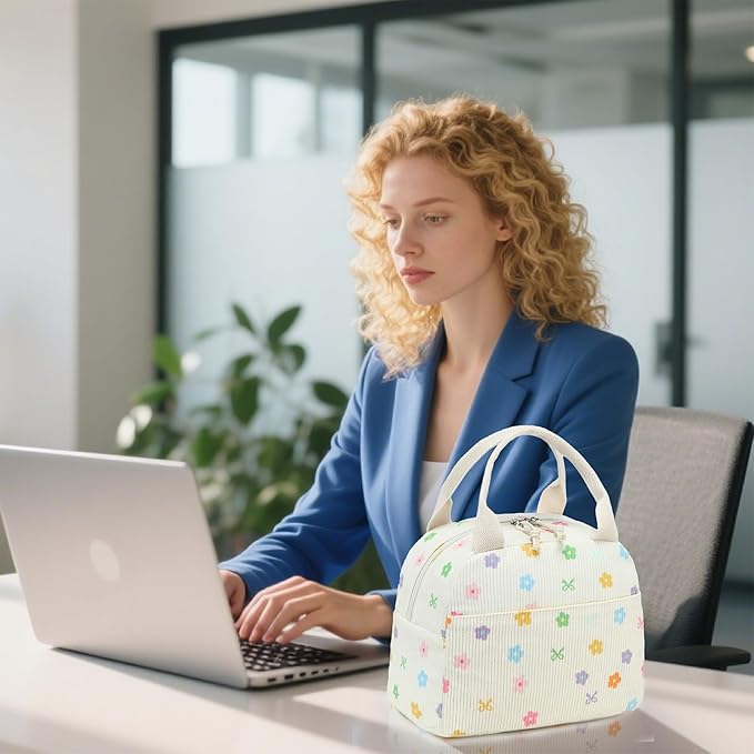 BTOOP Lunch Box for Women Men Cute Corduroy Lunch Bags Large Capacity Insulated Lunch Tote Bag For Work Travel Or Picnic (Colorful Floral Bow)