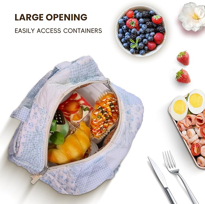 - Quilted Elegance for Commutes, Work, and Everyday Use-Crafted with beautiful printed quilted fabric, this lunch tote blends softness and style. The roomy interior easily fits lunch boxes, fruit, and drinks—perfect for the office, school, outdoor lunches, or daily errands
