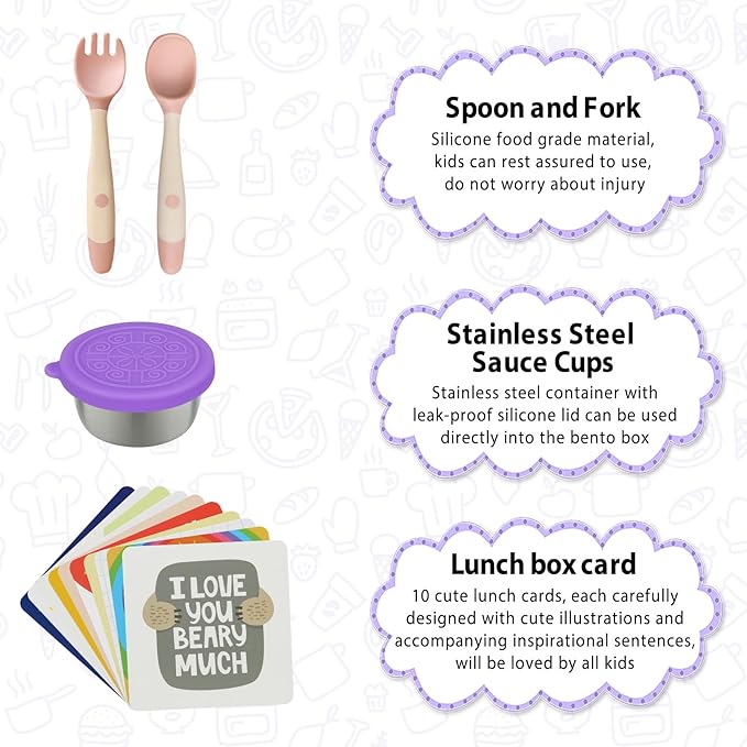 - The Best Bento Lunch Box for Kids - The insulation design of the insulated bag can keep food warm and easy to carry. The soft design of the fork and spoon makes it convenient for kids to use. The Stainless Steel Sauce Cups keeps the sauce or seasoning inside fresh. Each lunch card is carefully designed with cute illustrations and accompanying inspirational sentences. The unique cartoon pattern design attracts kids attention and helps them eat more lunch at school. Recommended Age 3+.