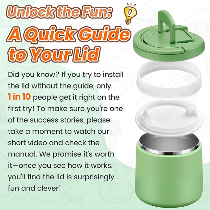 - Leak Proof Design: The compression vacuum design with seal washer guarantees 100% leak-proof, the hidden handle and hidden folding spoon are designed for easy opening and carrying. Don't worry about it spilling out and messing up kids lunch bag. Note, Pay attention to the front and back of the silicone ring when installing, otherwise it will lead to container leakage.