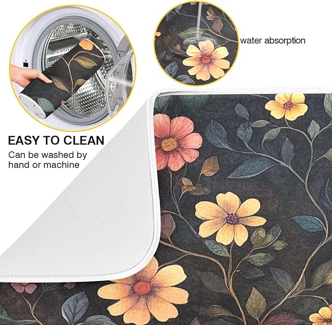 Retro Flower Vines Dish Drying Mat for Kitchen Counter Super Absorbent Dishes Pad Reversible Microfiber Protector Dish Draining Mats 16x18 inch