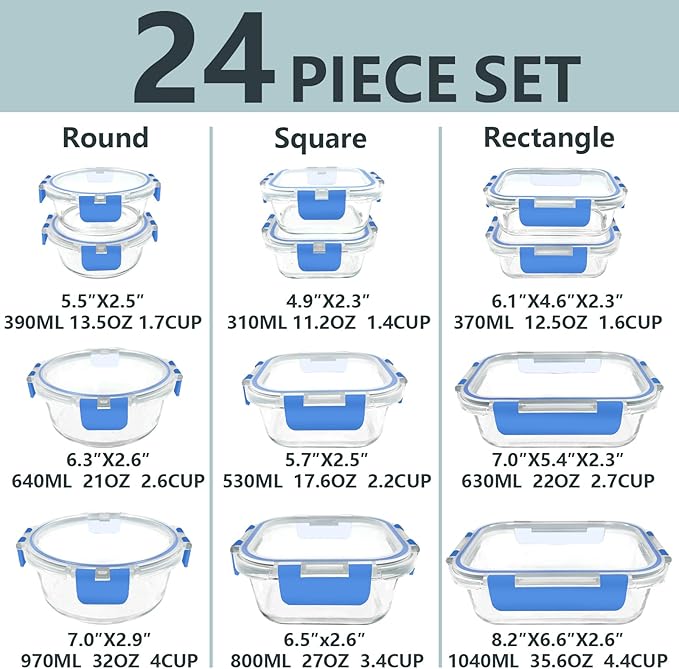 - 24 Pieces Glass Storage Container: This set includes 12 𝒑𝒊𝒆𝒄𝒆𝒔 𝒈𝒍𝒂𝒔𝒔 𝒄𝒐𝒏𝒕𝒂𝒊𝒏𝒆𝒓𝒔 𝒂𝒏𝒅 12 𝒑𝒊𝒆𝒄𝒆𝒔 𝒑𝒍𝒂𝒔𝒕𝒊𝒄 𝒍𝒊𝒅𝒔 with multiple sizes and shapes to fulfill your storage requirement, perfect for all your food storage needs. Package includes: Rectangular (1040ml,35.6 oz, 4.4cup/630ml, 22oz, 2.7cup/370ml, 12.5oz ,1.6cup), Square (800ml, 27oz, 3.4cup/530ml, 17.6oz, 2.2cup/310ml, 11.2oz, 1.4cup), and Round (970ml, 32oz, 4cup/640ml, 21 oz, 2.6cup/390ml, 13.5oz, 1.7cup).