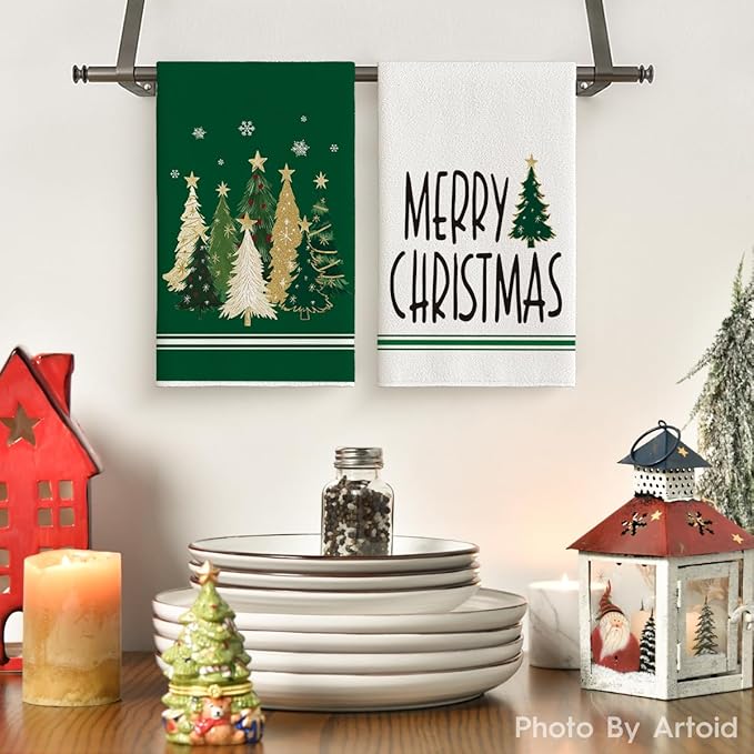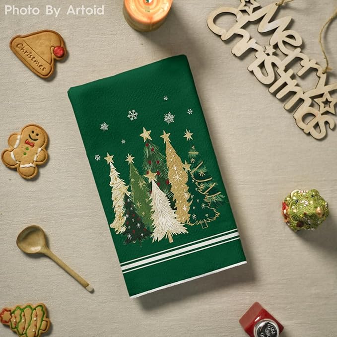 Artoid Mode Green Xmas Tree Merry Christmas Kitchen Towels Dish Towels, 18x26 Inch Farmhouse Star Snowflakes Decoration Cleaning Set of 2