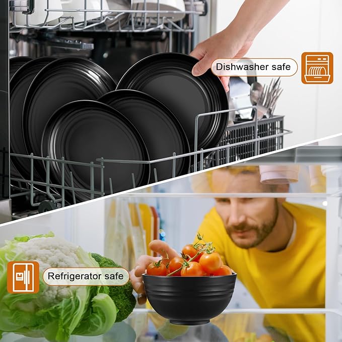 72 Pcs Plates and Bowls Sets, Unbreakable Wheat Straw Dinnerware Set Service for 8, Plastic Dish Set, Reusable Plates Bowls Cups for Kitchen, Camping, Outdoor, Dorm Microwave & Dishwasher Safe, Black