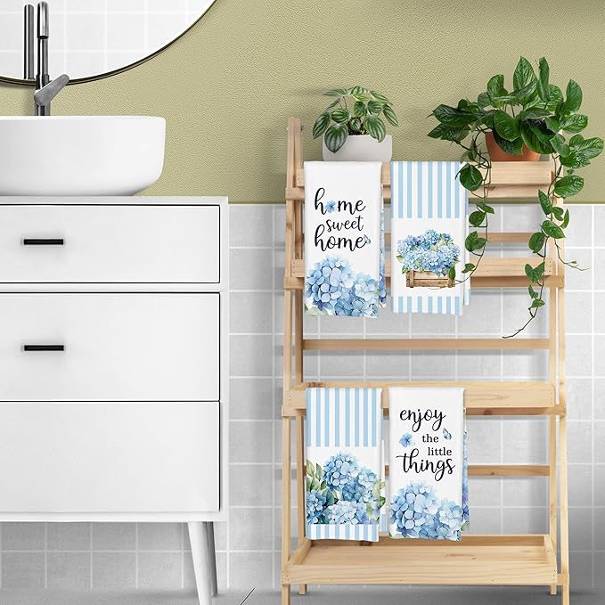 Blue Stripe Hydrangea Kitchen Towels Set of 4 - Home Sweet Home Blue and White Hydrangea Gifts Decorative Hand Towels for Bathroom, 16x24