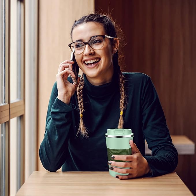 - Leak-Proof & Easy to Clean: The travel coffee mug features a secure screw lid with a sealing silicone strip and a convenient one-hand 180° flip-top snap for splash-free sipping, the wide mouth allows for easy filling and cleaning, comfort-grip silicone sleeve ensures a non-slip, secure hold, quiet base prevents slip