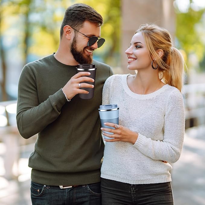 - Leak-Proof & Easy to Clean: The travel coffee mug features a secure screw lid with a sealing silicone strip and a convenient one-hand 180° flip-top snap for splash-free sipping, the wide mouth allows for easy filling and cleaning, comfort-grip silicone sleeve ensures a non-slip, secure hold, quiet base prevents slip