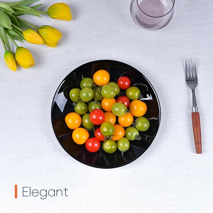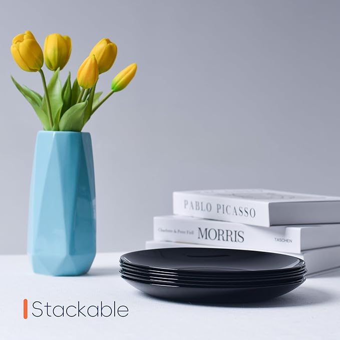 8.5 inch Salad Plate Set of 6, Lightweight Opal Glass Round Black Plates for Appetizer Dessert Kitchen, Dishwasher and Microwave Safe