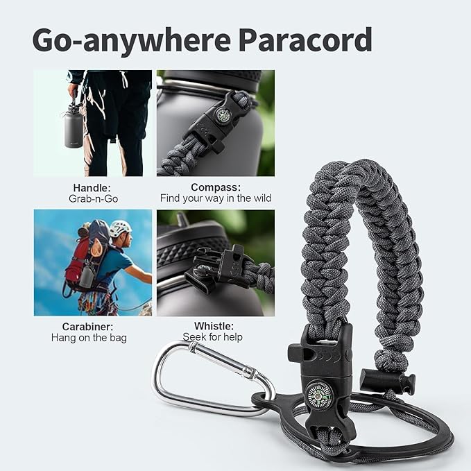 - Palm Fitting Paracord Handle: Compared to handle lids, nylon paracord on the bottle gives you more choices in terms of color coordination and coziness on your hands. Match the handle with your bottle to make a complete outdoorsy look. Compass and carabiner can be lifesavers for hiking and other expeditions