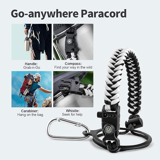 - Palm Fitting Paracord Handle: Compared to handle lids, nylon paracord on the bottle gives you more choices in terms of color coordination and coziness on your hands. Match the handle with your bottle to make a complete outdoorsy look. Compass and carabiner can be lifesavers for hiking and other expeditions