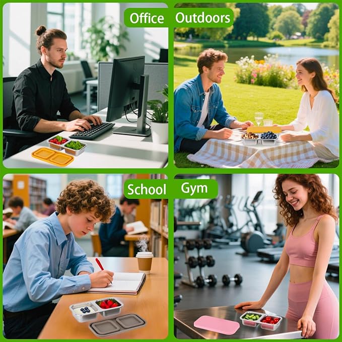 - 【LEAKPROOF DOUBLE COMPARTMENT DESIGN】 – Each stainless steel food containers features two separate compartments and a secure silicone-sealed lid that fits tightly to prevent leaks. This design keeps your snacks fresh and prevents mixing or spills, making it perfect for portion control and carrying multiple snacks mess-free. Ideal for travel, camping, or everyday use.