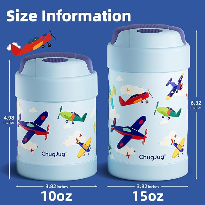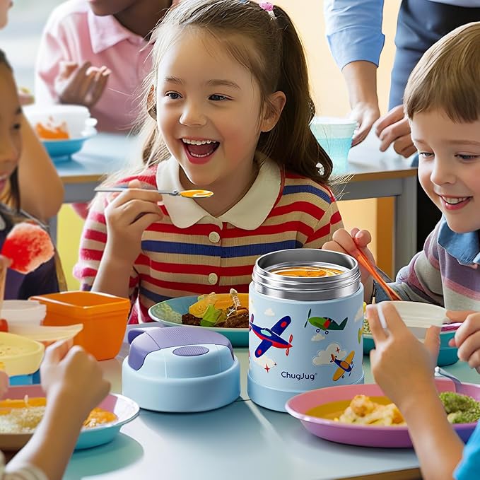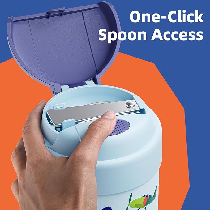 - Spoon Stays Inside – Never Lose It! ChugJug's easy-open thermo features a stored folding spoon! Press the button to unlock the spoon compartment, then lift out the food-grade stainless steel spoon. After use, fold and secure it back in the lid – no more lost utensils! The soft silicone handle makes this kids' lunch thermo safe to carry.