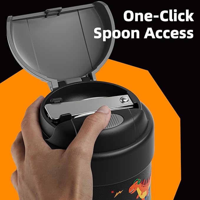- Spoon Stays Inside – Never Lose It! ChugJug's easy-open thermo features a stored folding spoon! Press the button to unlock the spoon compartment, then lift out the food-grade stainless steel spoon. After use, fold and secure it back in the lid – no more lost utensils! The soft silicone handle makes this kids' lunch thermo safe to carry.